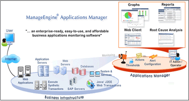 ManageEngine Applications Manager is an Availability and Performance Management Solution that proactively monitors Business Applications and help enterprises ensure that their web applications meet end user expectations.