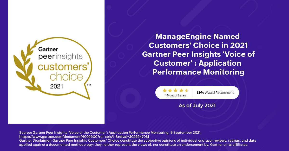 在 ManageEngine,客户一直是我们的第一要务。我们认为,我们对客户满意度的高度关注帮助我们在 2021 年 Gartner Peer Insights Voice of the Customer for Application Performance Monitoring 中获得认可。