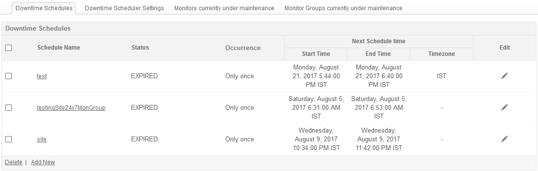 停机时间计划程序为您提供了计划可以暂停监控的时间段的选项。您可以选择重复的时间段-每天,每周或一次。您可以添加新的计划表,并从管理标签中查看。请按照给定的步骤添加计划表:
