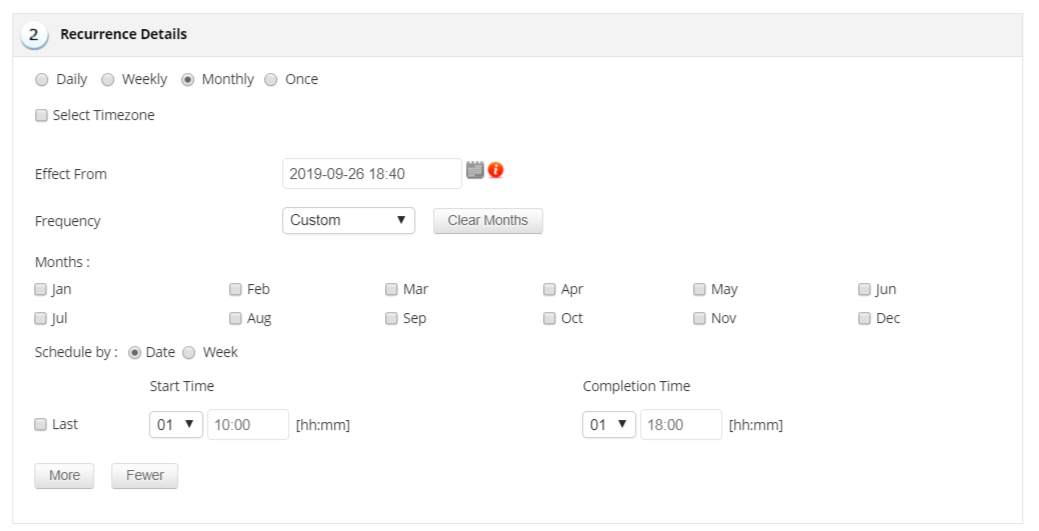 - 如果选择每月,请指定计划的频率-所有月份,交替的偶/奇月份,每季度,每三年一次,自定义和每两年一次。如果选择了自定义,则必须选择月份,然后选择是要根据日期还是按周指定计划表,而必须提供开始时间和完成时间。