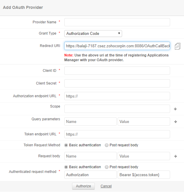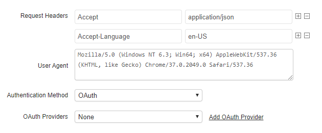 - OAuth:此选项使您可以使用OAuth(开放式授权)访问HTTP URL。可以通过从下拉列表中选择访问URL所需的OAuth提供程序来进行配置。另外,您可以通过点击添加Oauth提供商链接来创建新的OAuth提供商。(请参阅Oauth提供商)