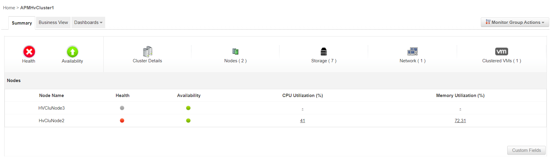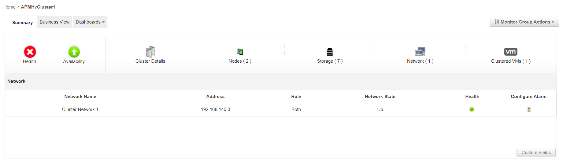 使用Hyper-V群集监视组概述页面,您可以一眼就知道群集中关联的运行状况、可用性和节点数。您还可以跟踪各种配置详细信息,如节点数、网络数、仲裁所有者节点等。