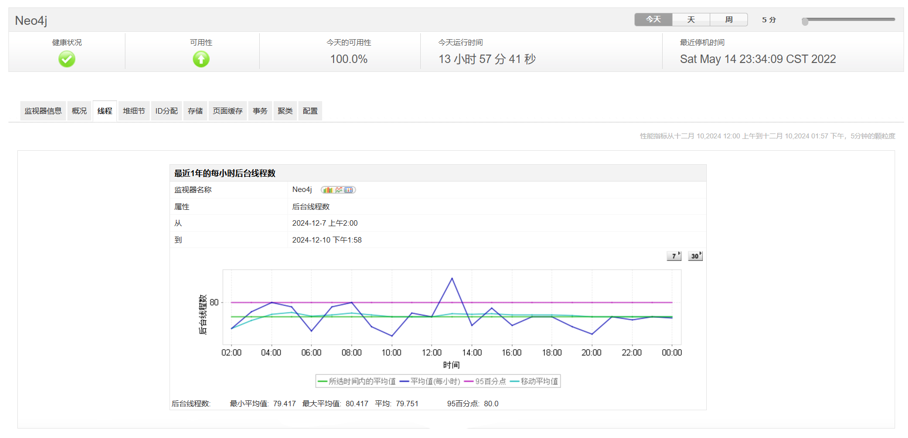 Applications Manager的Neo4j管理工具提供了服务器中的线程操作。它给出了运行线程、守护线程、峰值线程和活动线程的总数。通过识别占用时间的线程并对它们进行优先排序,可以减少数据库查询的响应时间。有关ID分配的信息,如节点ID、属性ID、关系ID和关系类型的数量,可以随时使用。