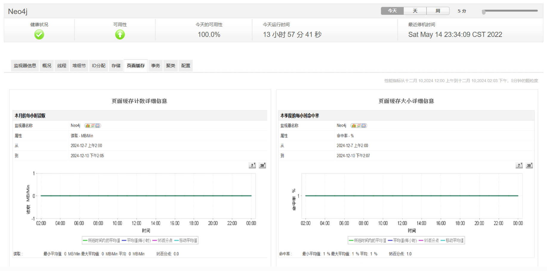 页面缓存用于存储存储在磁盘上的Neo4j数据。Application Manager的Neo4j性能监视功能提供页面缓存计数细节和页面缓存大小细节。命中率、刷新、命中、错误、清除、映射和未映射的文件等缓存指标有助于可视化缓存过程,并揭示可以解决的差异。确保大多数来自磁盘的图形数据缓存在内存中,将有助于避免频繁访问磁盘,这将花费时间。