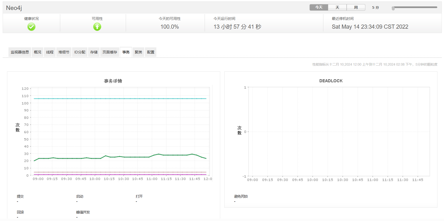 通过识别并避免陷入死锁的事务来优化响应时间。使用Neo4j指标监控软件跟踪诸如启动、峰值并发、打开、提交和回滚事务等指标。