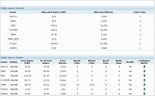 ManageEngine Applications Manager provides indepth Oracle Tablespace monitoring in addition to overall Oracle Performance Monitoring. Oracle tablespaces are the logical database structures that hold data for an Oracle Database. Each tablespace points to data files where the data is physically stored. An Oracle table space can consist of indices, tables, and other database objects. It is hence important for the database administrator to perform tablespace monitoring.