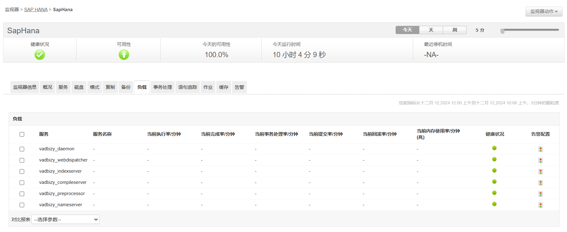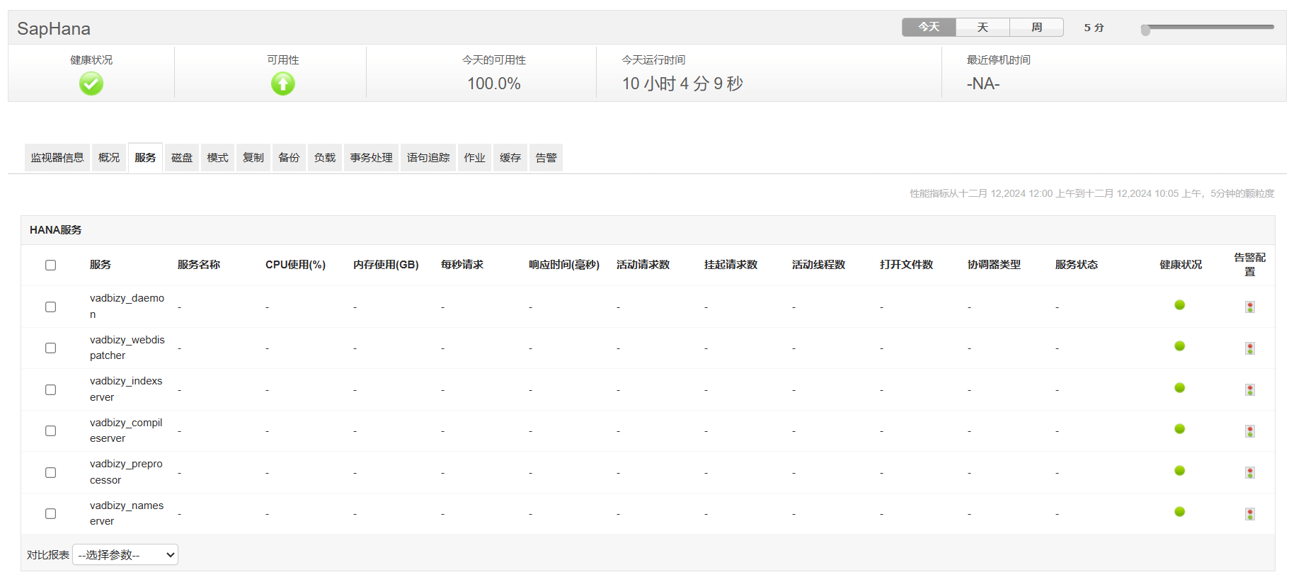 检查 SAP HANA 数据库的关键服务当前是否处于活动状态,以及其处理请求的速度。了解每个服务所使用的 CPU 和内存量、每个服务当前有多少待处理的请求,以及活动的线程数。
