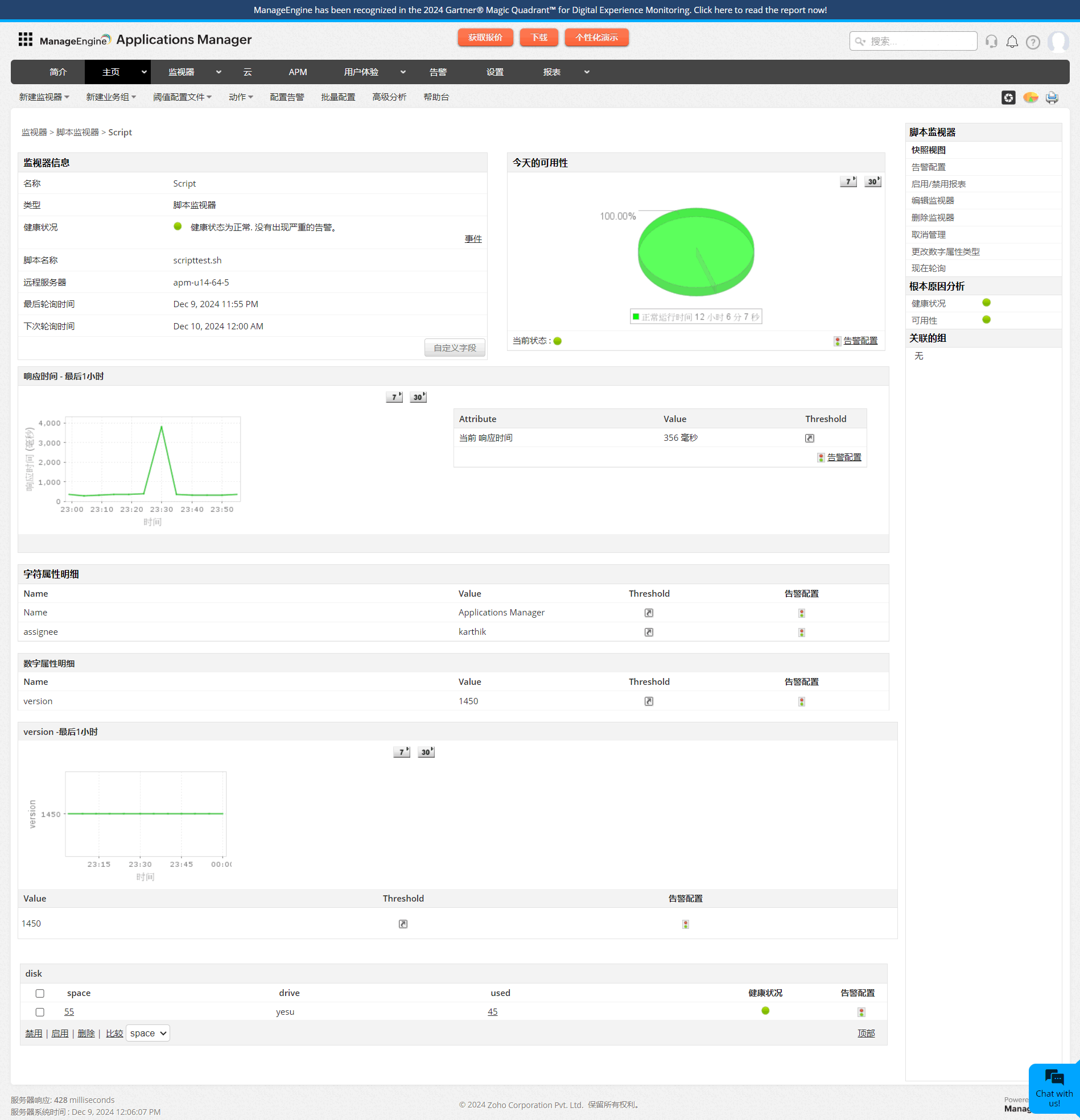Applications Manager基于轮询间隔执行脚本,脚本会将其输出转换到已配置的输出文件。Applications Manager解析输出文件并执行已配置的操作。针对配置属性的报表将以图表的形式显示。