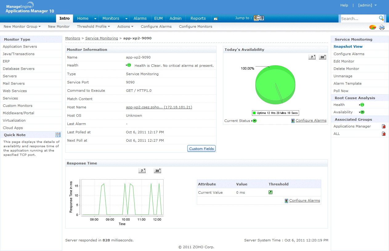 Applications Manager可以深层次监视运行于TCP端口的服务,例如FTP-21、Telnet-23等。Applications Manager监视是否可以连接以及连接时间。