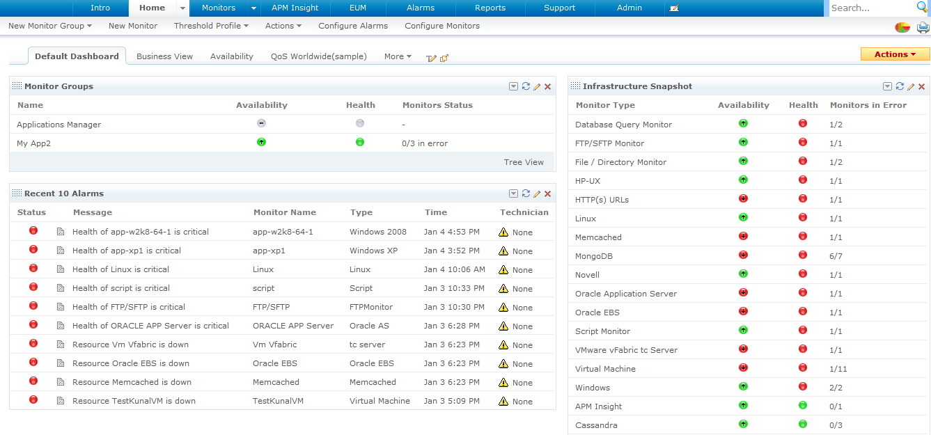 不同的视图可供监控不同IT资源的性能,如商业应用、监控模板、告警和报表。同时,针对只有管理员才能访问的管理操作提供了一个独立的视图。它简化了IT管理任务而且非常易于操作。