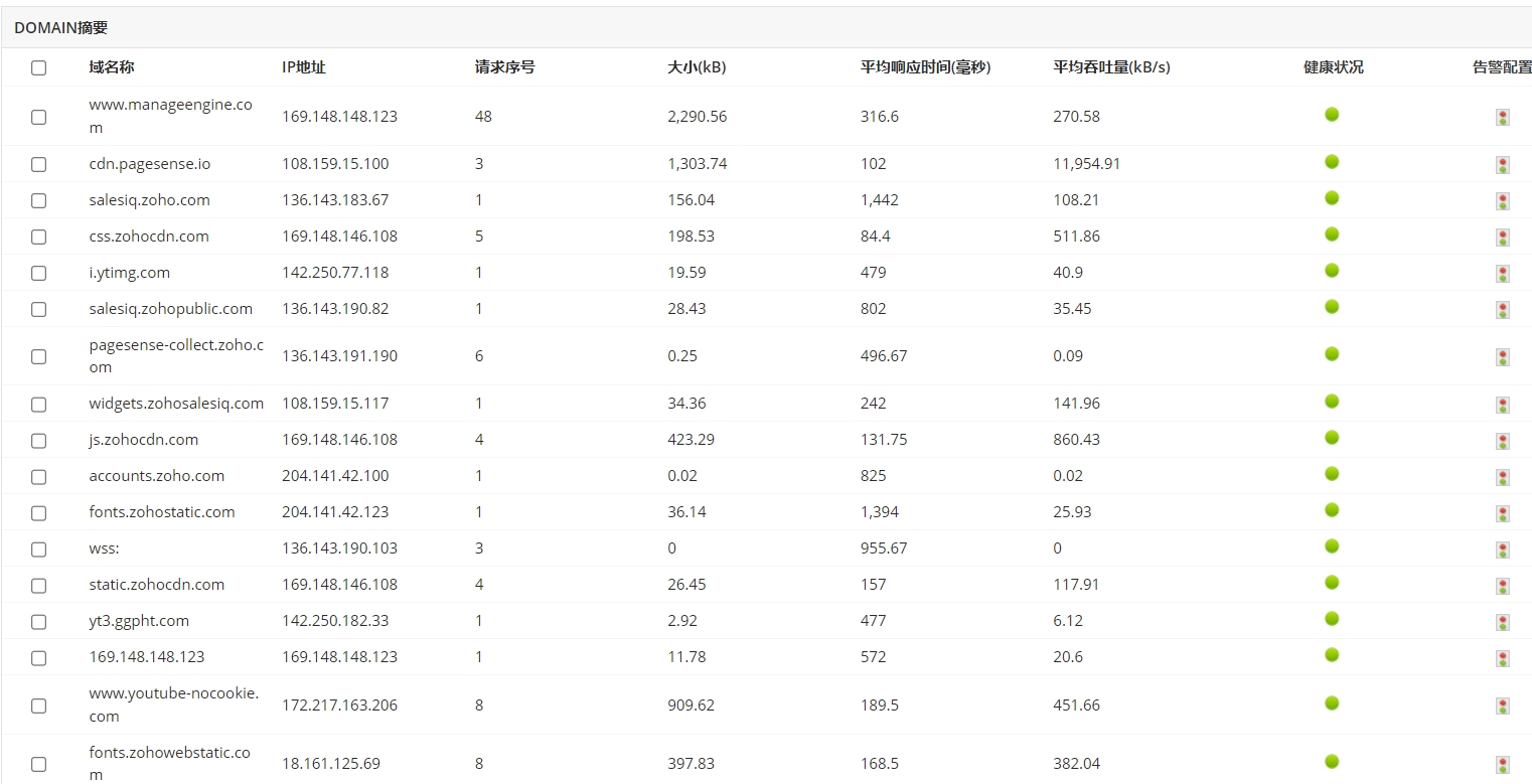每个URL包含一个域名以及其他有助于查找特定页面的段。Applications Manager的网页分析器工具监视有关网页域的以下指标: