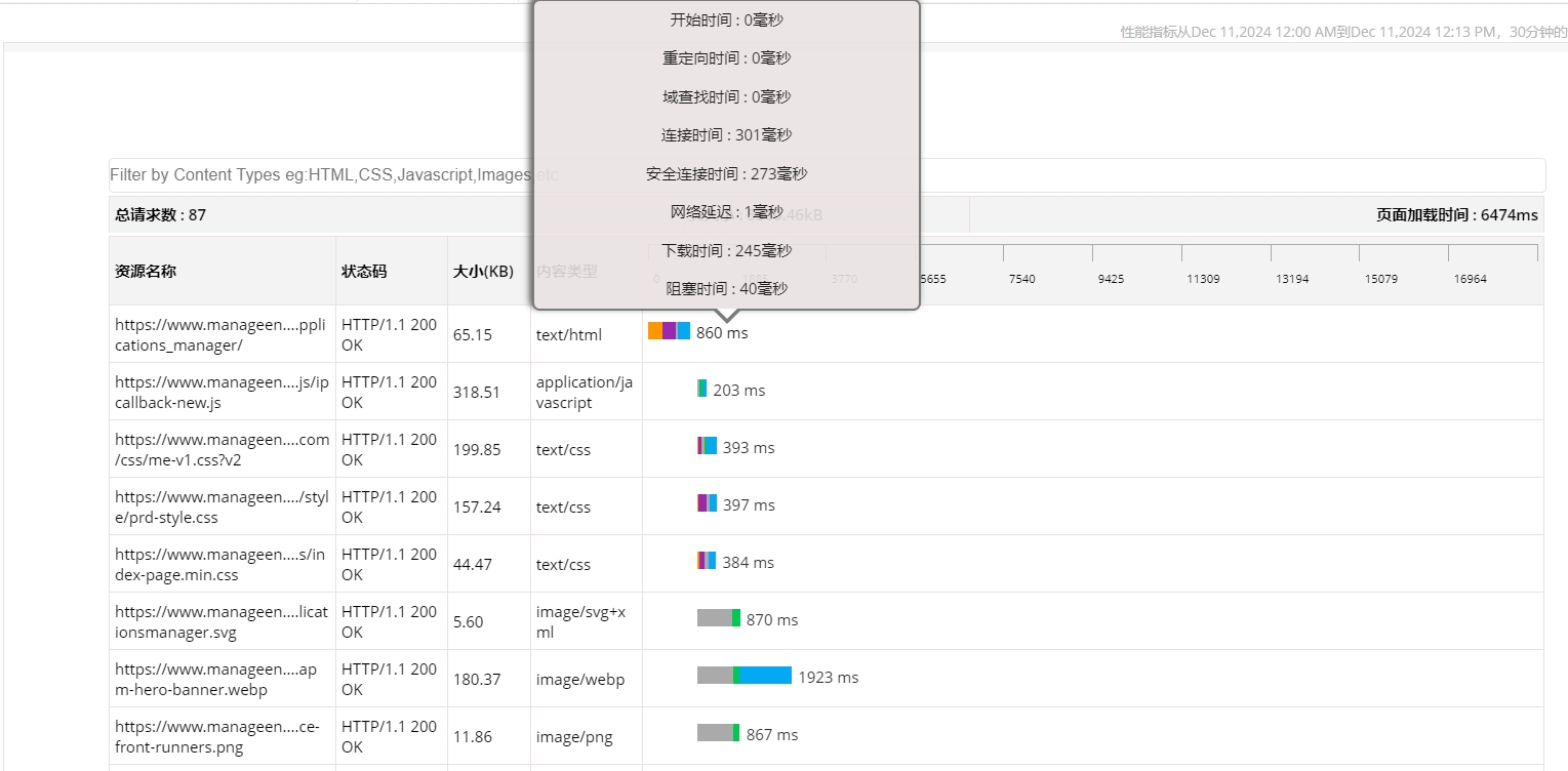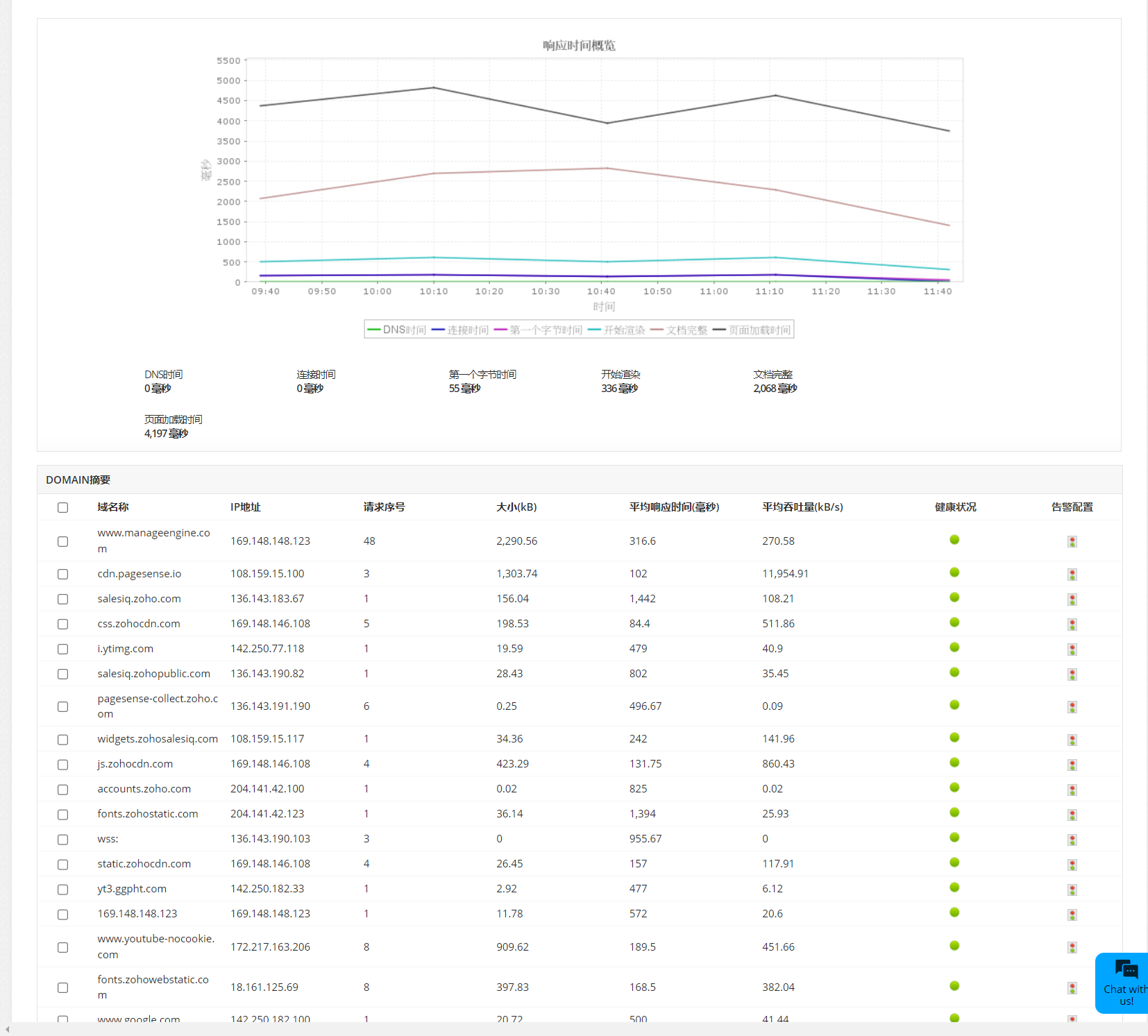 - 跟踪响应时间摘要。监控网页中的响应时间是网页分析的一个重要方面,有助于发现网页是否正在加载和有效工作。网页的响应时间包括各种其他组件指标,如DNS时间、连接时间、第一字节时间、开始呈现、文档完成和页面加载时间。监视这些指标可以帮助识别各种问题,如繁忙的服务器、压倒性的请求和网络问题。