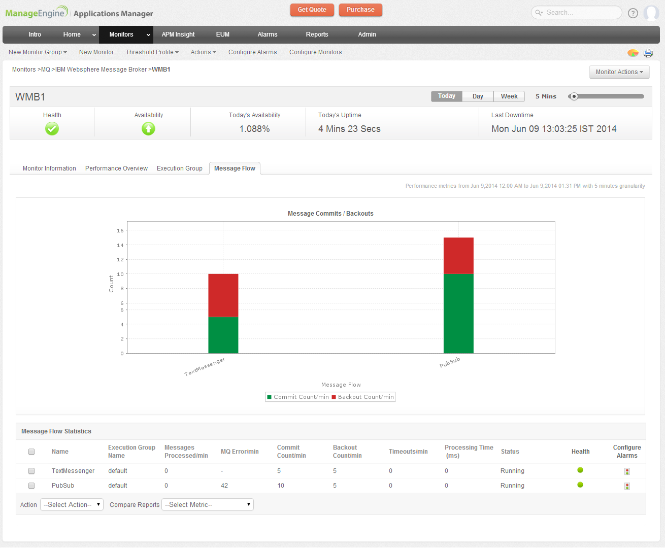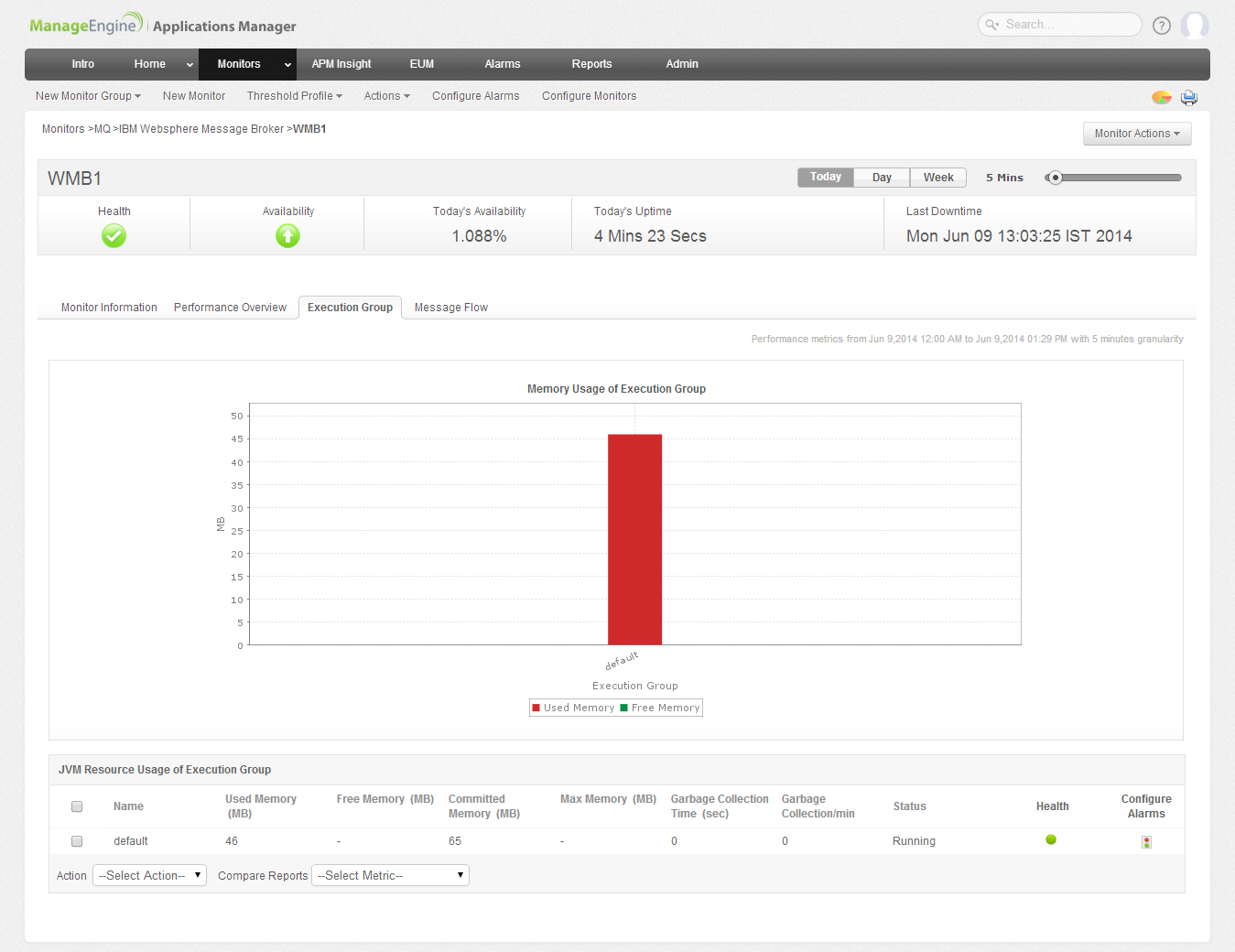 Applications Manager monitors availability and performance of the Message Broker, execution group and message flow and memory usage of the execution group. Resolve incidents before they become an issue, enjoy improved service levels and reduced risk of downtime within your WebSphere MQ infrastructure. You can also collect Message Flow Accounting and Resource Statistics and configure thresholds to the attributes monitored by the server based on these details. The monitoring details of IBM WebSphere Message Broker are represented graphically that helps to understand the parameters with ease.
