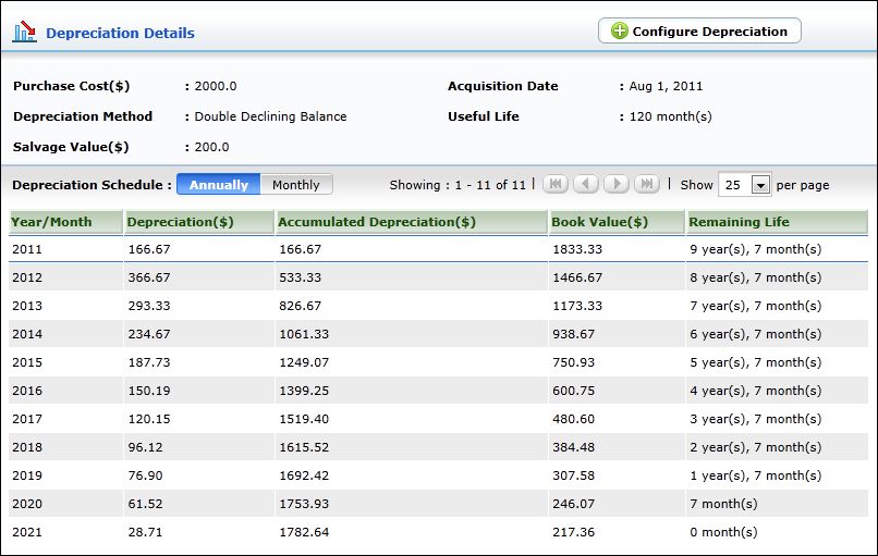 The Depreciation Details block shows information such as the Purchase Cost and Acquisition Date of the asset, the Depreciation Method, the Useful Life and the Salvage Value of the asset. The Depreciation Schedule lists the depreciation details in tabular format and can be viewed either Annually or Monthly.