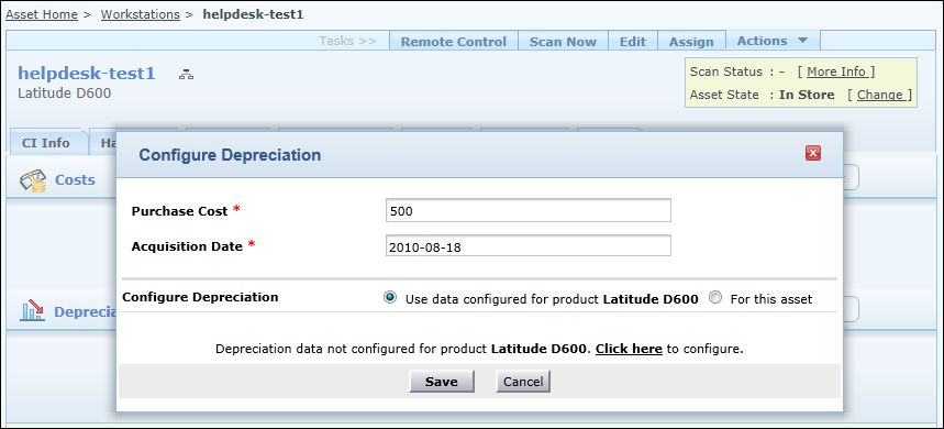 - Click Save button. The configured depreciation details will be applicable for all the assets with Model Latitude D600.