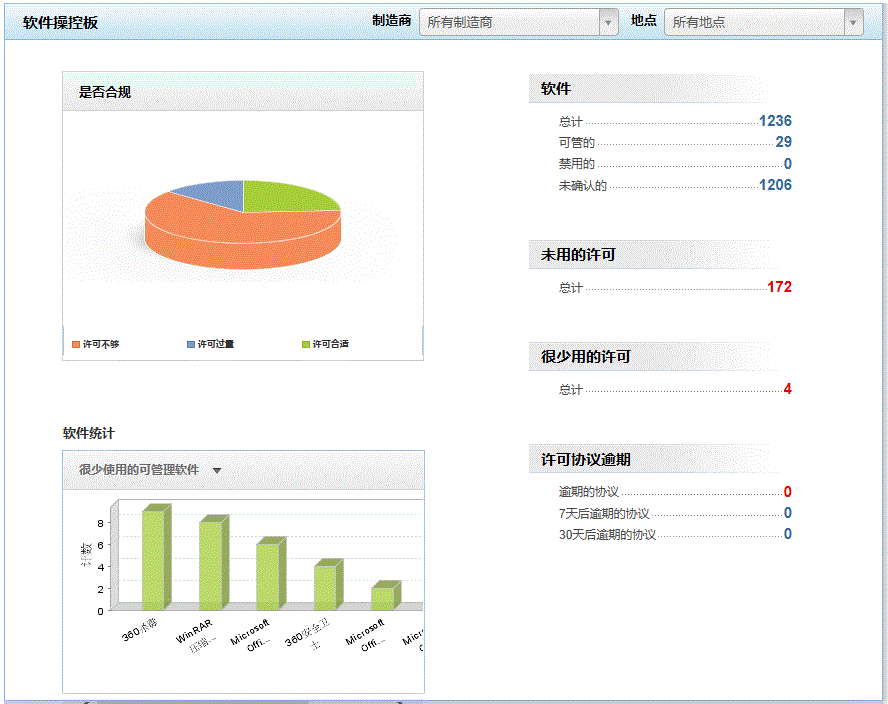 AssetExplorer在扫描网络时,会自动发现工作站中可用的软件。它所提供的软件概要画面,可以帮助您: