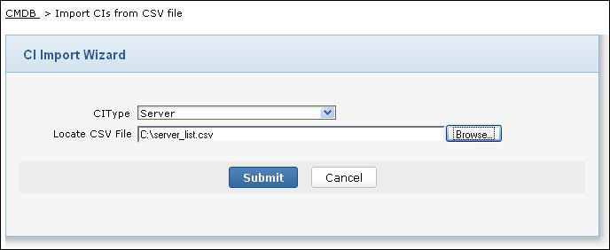 2. Click Import CIs from CSV file link. The CI Import Wizard is displayed.