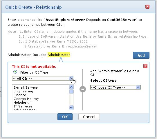 You can also create relationships between CIs that are unavailable in your CMDB. Say, for instance, if Administrator is unavailable in your CMDB, then you can add Administrator as a new CI by selecting the CI Type from the drop-down. Click OK to view the CI in the relationship map.