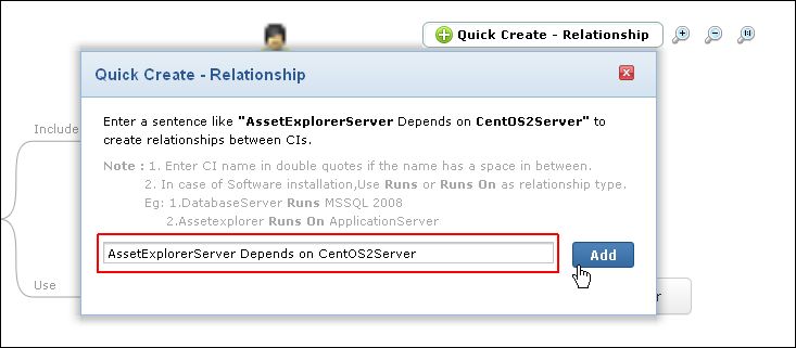 Say for example, enter a sentence like AssetExplorerServer Depends on CentOS2Server. Here, AssetExplorerServer forms the first piece of information, Depends on is the relationship type and CentOS2Server forms the dependent CI.