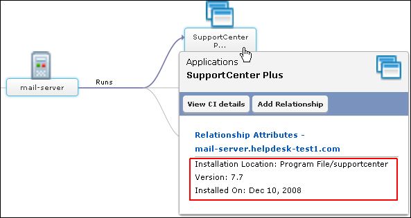 The Relationship Attributes are configured while setting the default Relationships for a CI Type. To view these relationship attributes on the relationship map, move the mouse pointer over the CI.