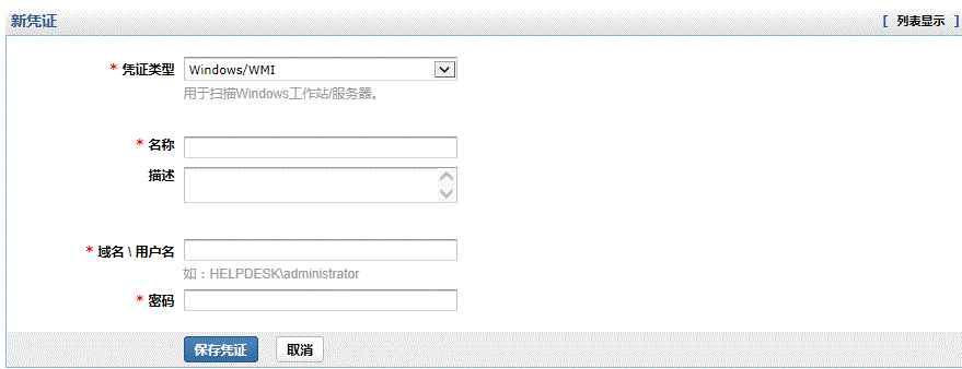 凭证库用于保存资产扫描/远程控制过程中使用各种凭证。可以在网络扫描,单体扫描或者远程控制时关联这里已配置的凭证。 凭证支持的协议包括:WMI、Telnet/SSH、 SNMP V1/V2 和 VMWare。