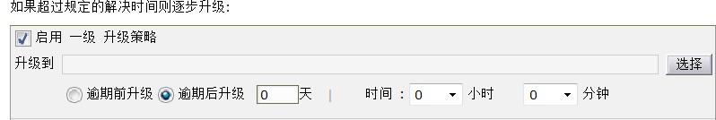 如果请求在指定的解决时间内没有解决,就可以设置升级级别以便通知。要设置升级级别,只需选择启用一级升级策略复选框,将展开1级通知窗口。
