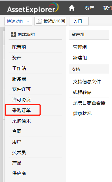 “创建新”是快速导航器,可立即访问“新建采购订单”表单。
