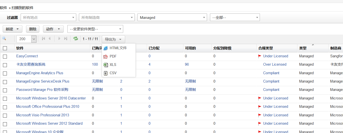 Asset Explorer允许将软件许可详细信息[从软件许可列表视图页]和扫描的软件详细信息[从扫描软件列表视图页]导出为PDF / XLS / HTML / CSV文件。
