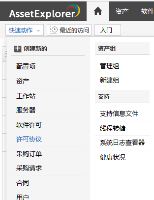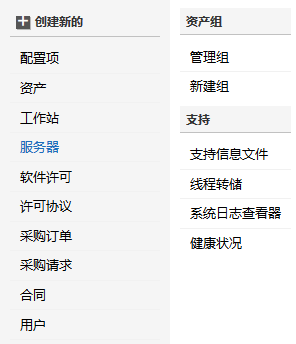 创建新的下拉菜单是创建新配置项,资产/组件,工作站,服务器,软件许可和许可协议,采购订单,合同,用户,产品和供应商的快速导航器。