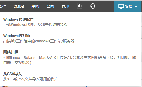 使用扫描下拉列表,立即扫描您的所有Windows域,网络中的Linux,MAC,Solaris,AIX计算机等机器,以及基于IP的IT资产。