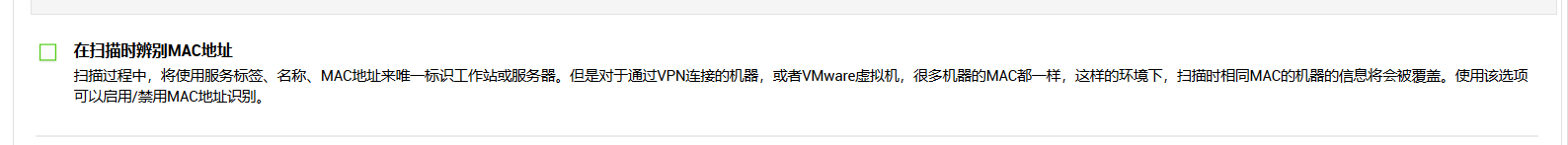在某些环境中,许多机器(VMware或通过VPN连接的机器)中的MAC地址可能相同。可以在 发现"-> 扫描设置下启用或禁用唯一的MAC地址标识。