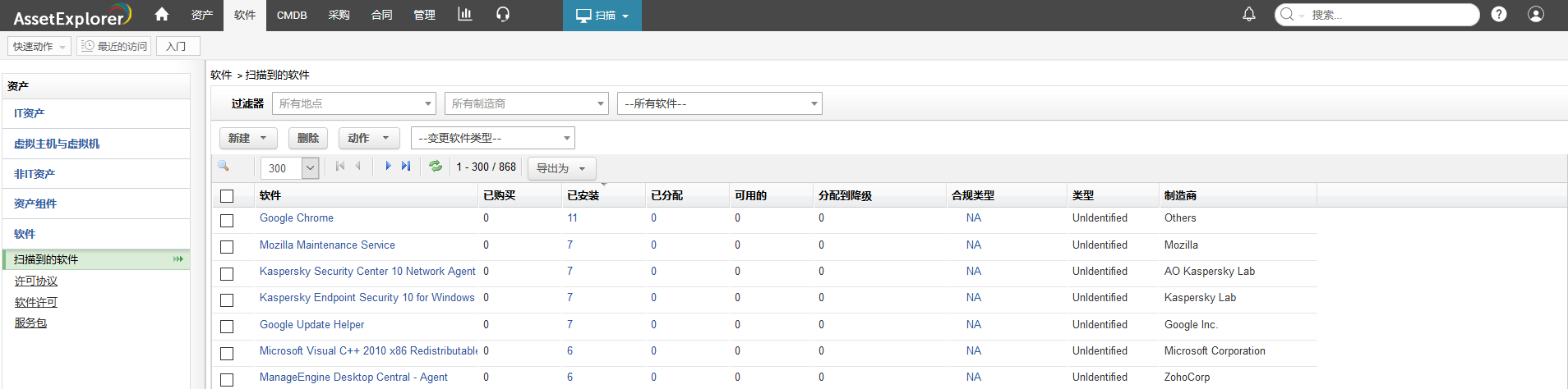 在扫描工作站时,还将扫描工作站中安装的软件,并在软件的扫描的软件下列出这些软件。在扫描的软件列表视图页面中,您可以获取详细信息,例如制造商,软件类型,软件的安装数量等。
