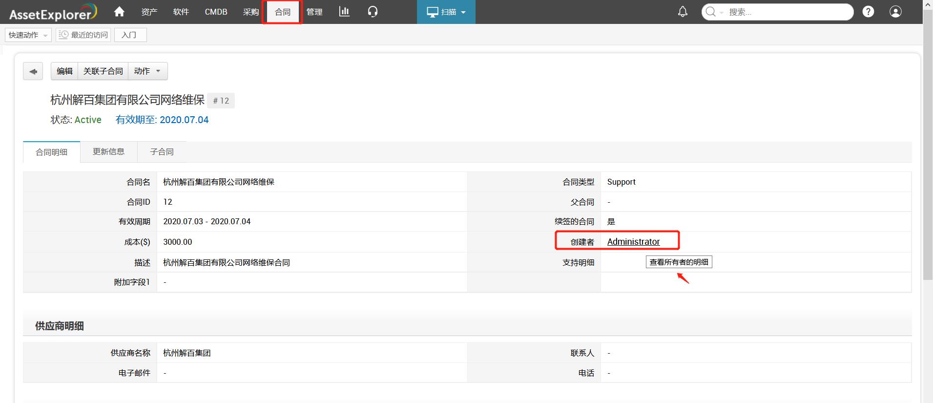 在合同页面中,单击创建者,单击可查看所有者明细。