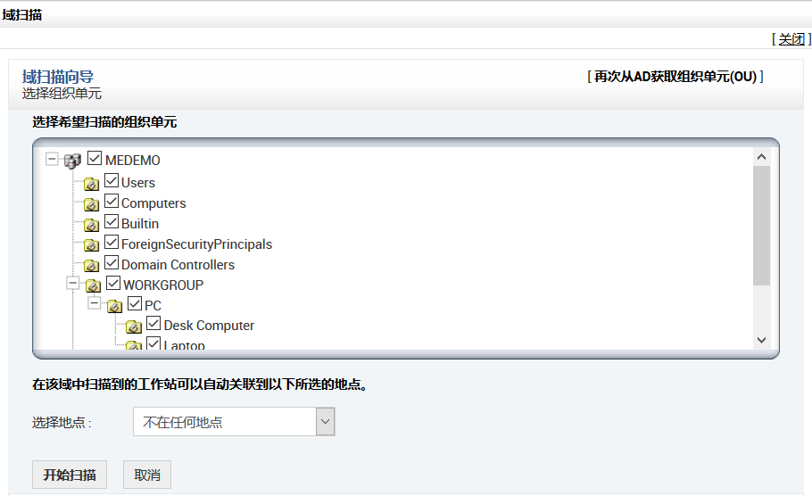 选择网站从扫描的工作站关联选择地点选项。仅在指定地点时此选项才可用