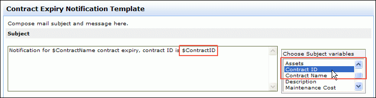 The page opens to display the Subject and Message contents for contract expiry notification. You can compose the mail by selecting the variables from the pick list beside the Subject and Message block.