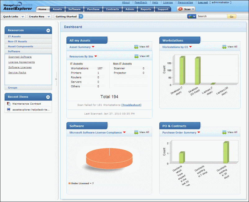 The home page for all users of AssetExplorer has various useful information displayed that enables an administrator, a technician, and a requester to take necessary action. Based on the login credentials of the user, the following are available in home page,
