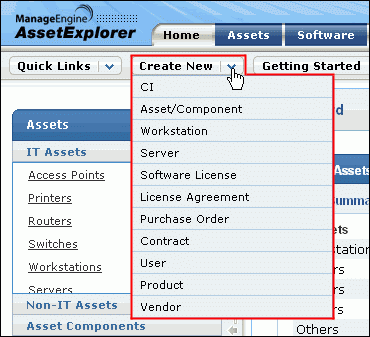 The Create New drop down is a quick navigator to create new CI, Asset/Component, Workstation, Server, Software License and License Agreement, Purchase Order, Contract, User, Product and Vendor.