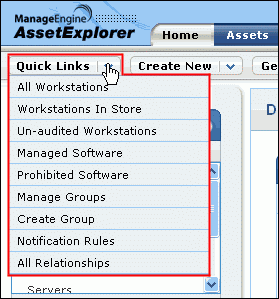 Quick Links is a quick navigator to instantly view All Workstations, Workstations In Store, Un-audited Workstations, Managed Software, Prohibited Software, Manage Groups, Create Group, configure Notification Rules and view All Relationships.