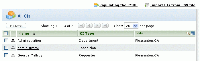 Consider another instance for conducting a search for the search string "admin" under All CIs. The search operation would result in CIs beginning with the word admin, such as, Administrator, Administration, Admin and users under the department Administration.