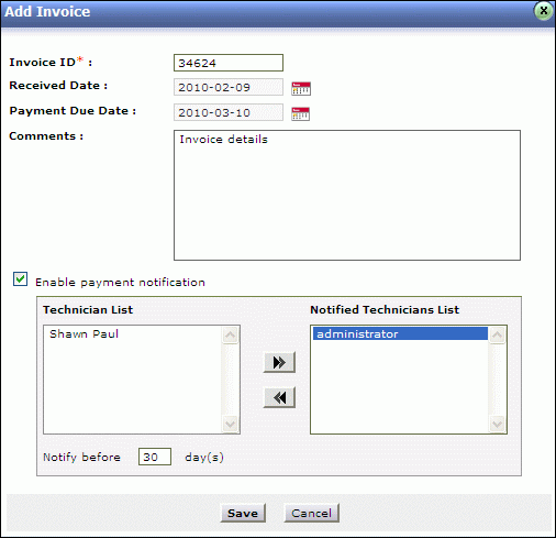Select the technicians from the list for payment notification. Click >> button.