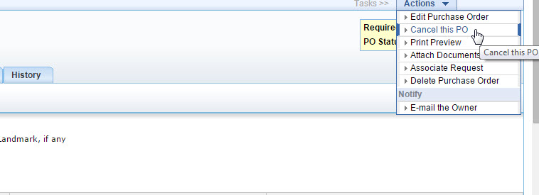 • Further information about that cancelation can be viewed by either hovering your cursor over the canceled PO in that list or by checking the History tab in the PO details page.