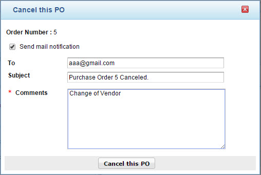 6. After you have added the comments or enabled email notification, click on Cancel this PO. The PO will be canceled.