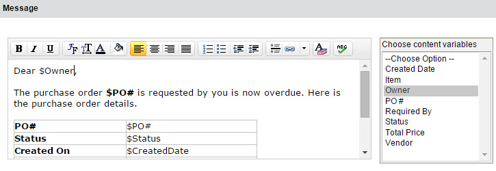 For eg, If you want to add “Owner”, click on “Owner” from under the Choose content variable it will get added to your content.