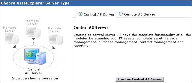 You can install AssetExplorer as a Central Server by choosing the server type as Central AE Server on starting the application for the first time. The application is started as the Central AE Server.