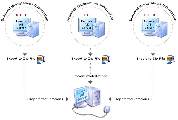 In a wide spread organization distributed across various sites, the Central AE Server may not be able to access all the assets in sites. Hence, a Remote AE server is installed in each site which scans and maintains all the workstations, and user information of the respective sites. The data from the Remote AE Server is pushed to the Central AE Server either manually or by scheduling the data periodically.