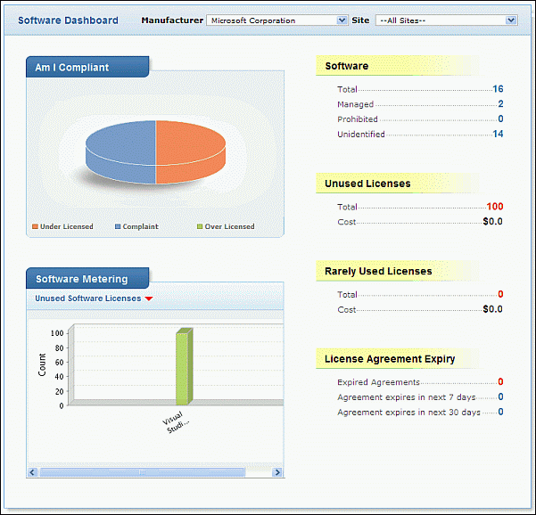 facilitate easy access to view the total number of softwares that are unused, rarely used, managed, prohibited and unidentified for the selected Manufacturer and Site.