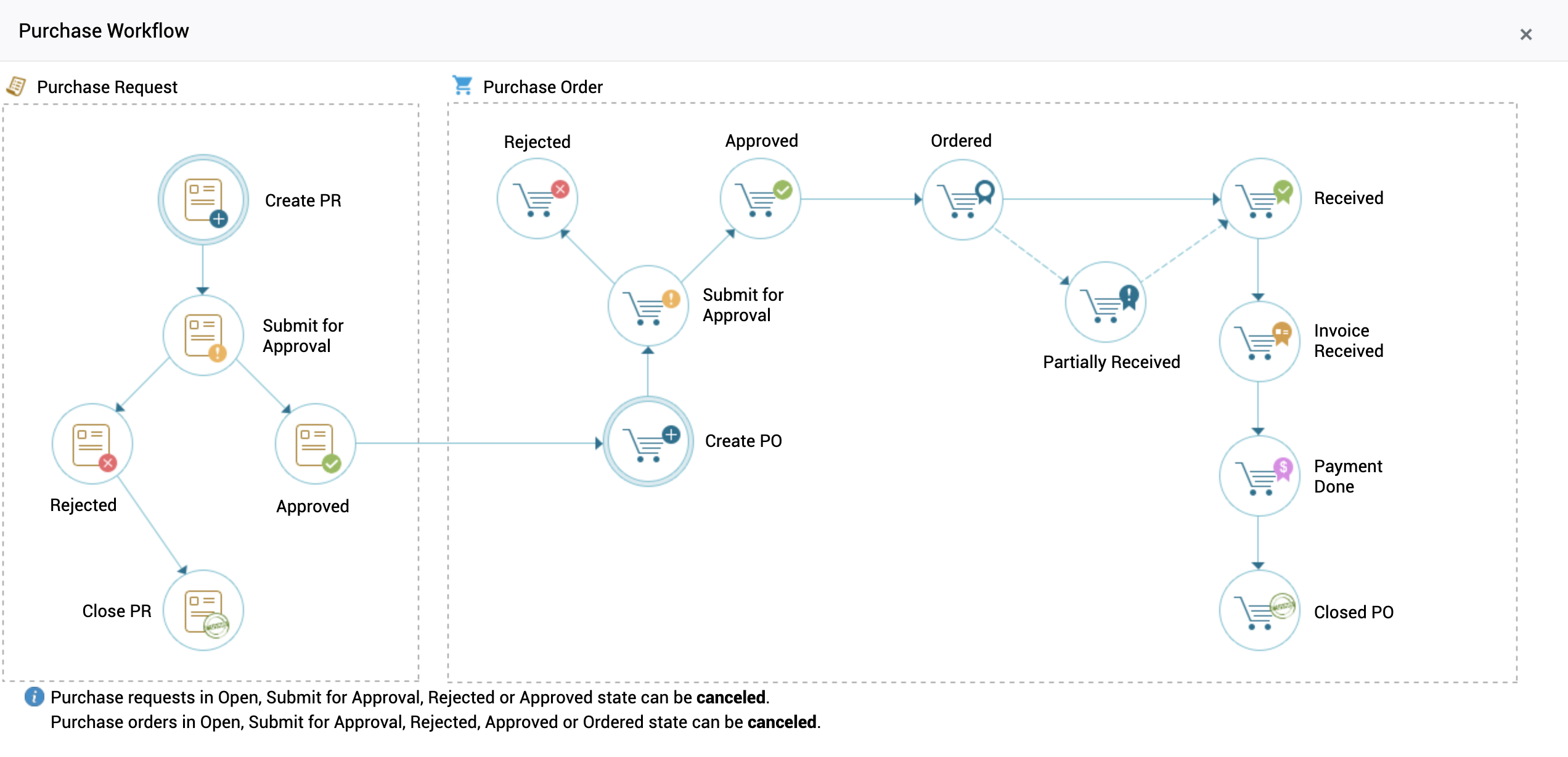 一旦资产到货,采购订单的发票详情将被记录,并转为“发票已接收”状态。当收到付款后,这些信息将更新至采购订单中,并最终完成关闭。