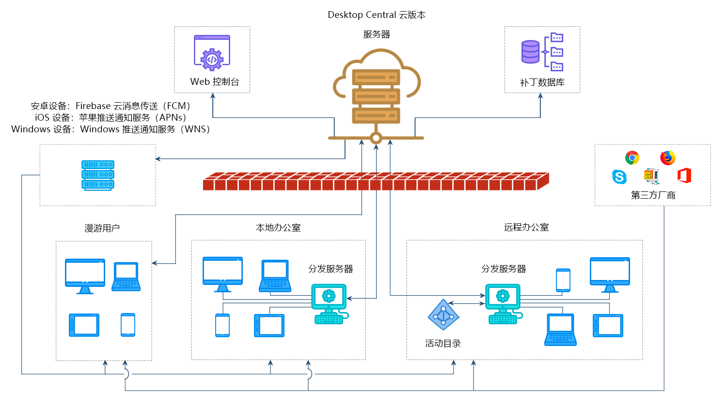 分发服务器 用于管理远程办公室的计算机,安装在远程办公室的其中一台计算机上。分发服务器与 Endpoint Central 云版本服务器通信,为该远程办公室的代理获取任务。此外,分发服务器会与 Endpoint Central 云版本服务器同步缺失的补丁信息。然后,这些补丁会直接从各自的供应商网站下载,并根据每个计算机上缺失的补丁的状态分发到各个远程办公室代理。远程办公室代理会将每个任务的状态发送回 Endpoint Central 云版本服务器。