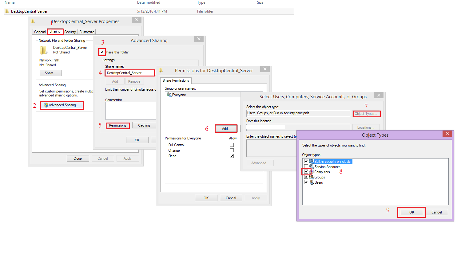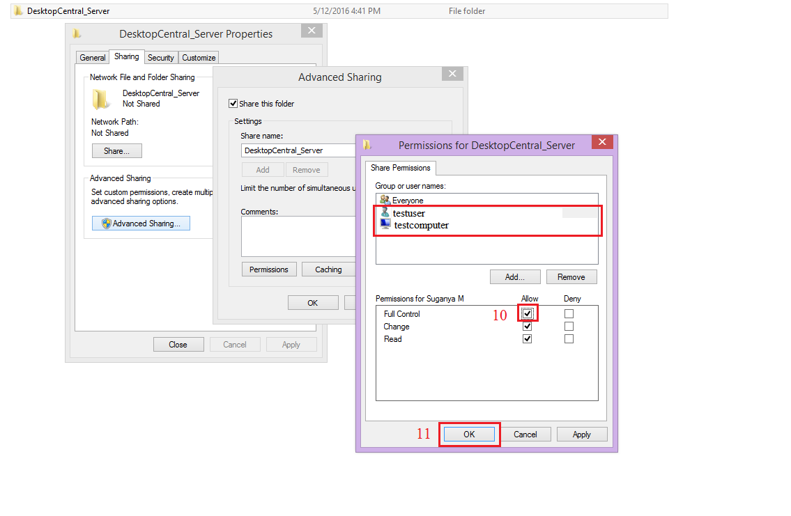 如果Desktop Central服务器是安装在Windows 10或Windows Server 2012 R2, 就要修改这里的许可, (右键单击) Desktop Central文件夹 -> 属性 -> 安全 -> 编辑许可 -> 编辑 -> 添加 (添加备用服务器的名称)。