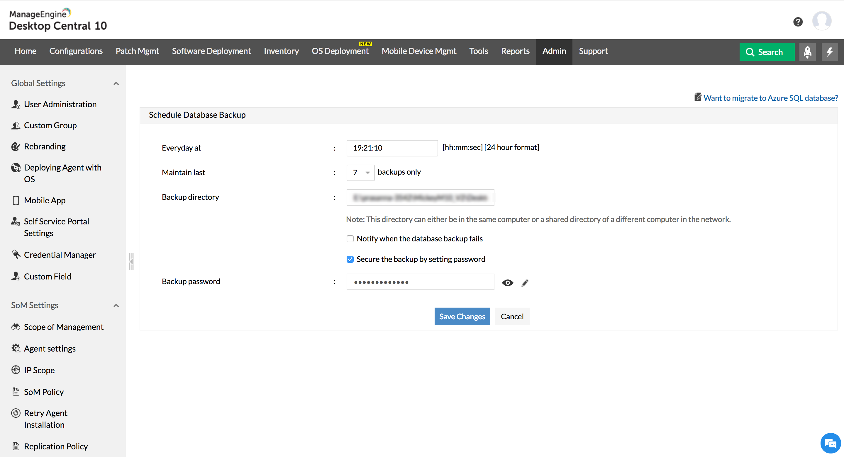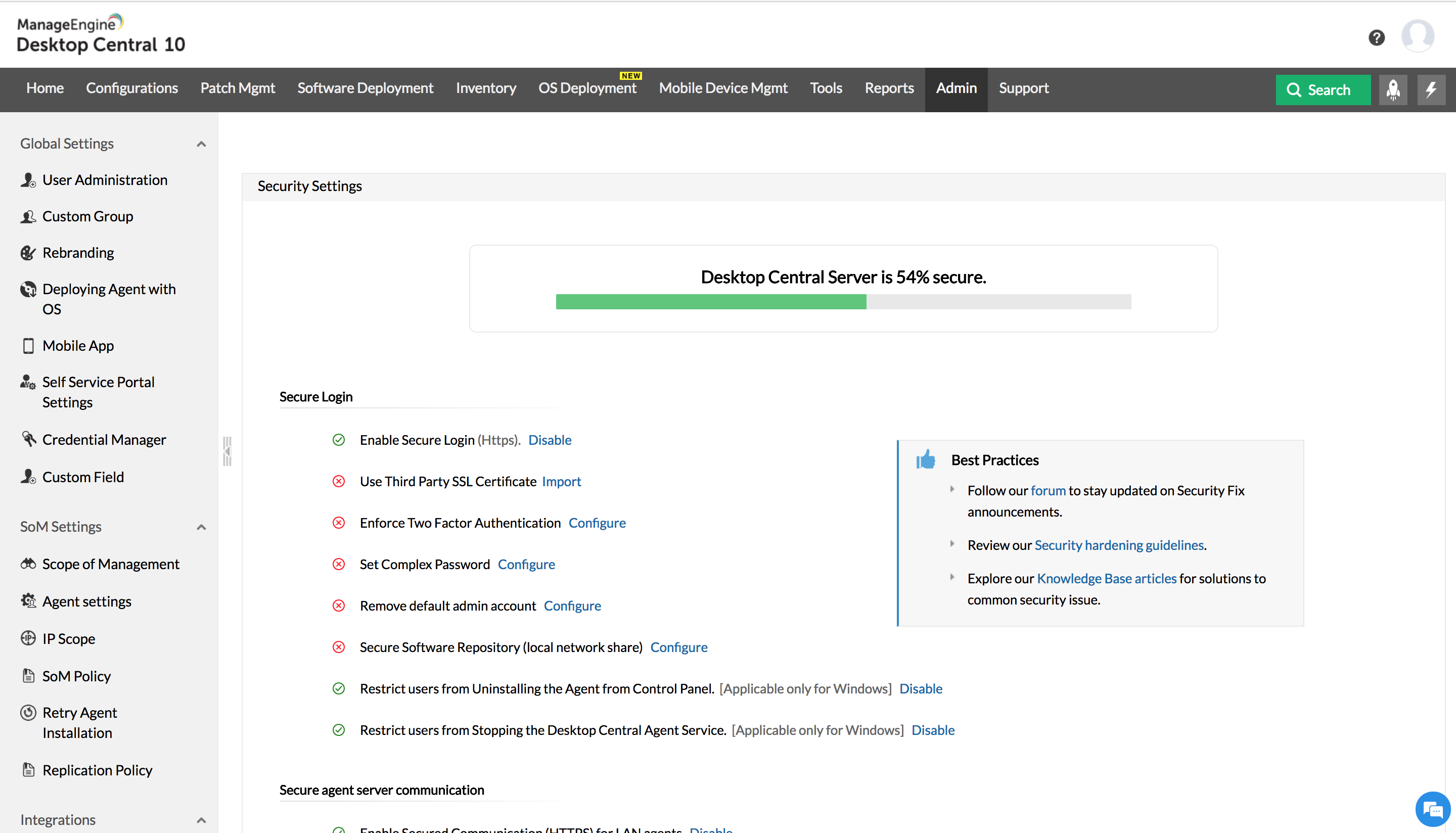 打开Endpoint Central控制台,导航到管理 -> 安全设置。您可以从此视图中查看Endpoint Central服务器的安全等级。建议每项设置都启用,使服务器达到最高安全等级。